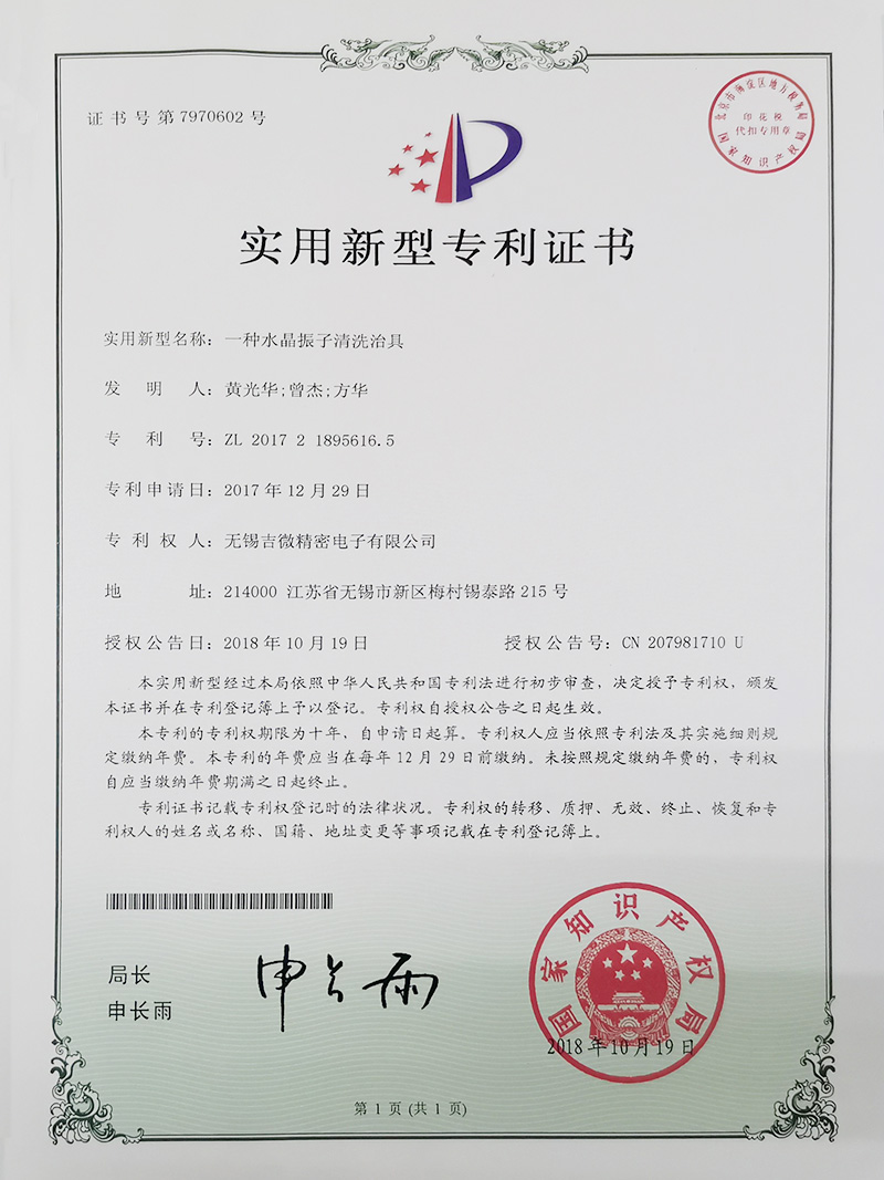 一種水晶振子清洗冶具實(shí)用新型專利證書