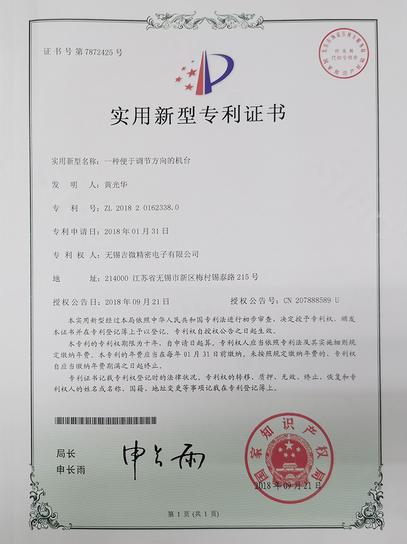 一種便于調(diào)節(jié)方向的機(jī)臺(tái)實(shí)用新型專利證書